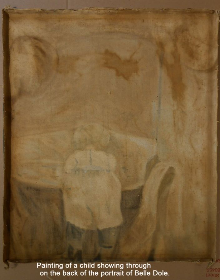 When uncovering the back of the painting, we discovered that the artist painted Mrs. Dole on to of a painting of a child!