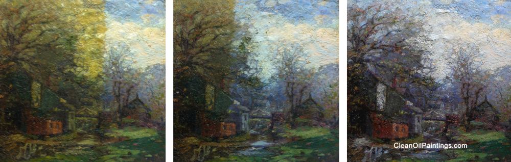 The middle photo shows the painting during the cleaning process.  Note the color of the sky and cobblestone street on the left side of the painting.