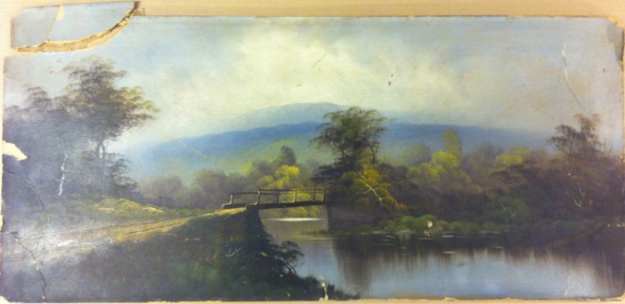 This early 20th Century oil painting on paper-board suffered from neglect and a bad fall.  The fragile corners were mashed and broken, and it had several gouges in the surface. The pieces were re-assembled and mounted onto a new board for stability.  Then the painting was cleaned, cracks repaired, and careful retouching finished the job.